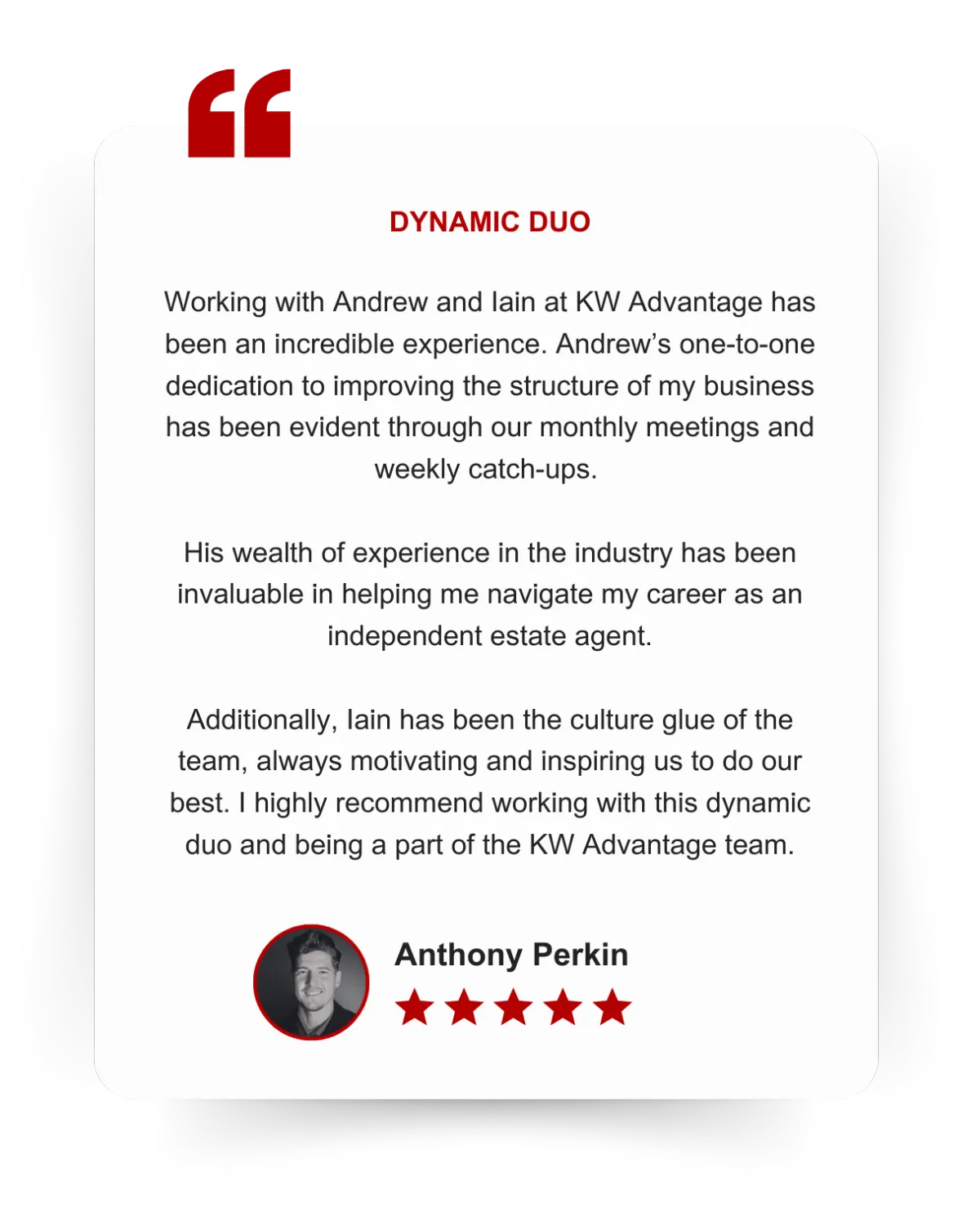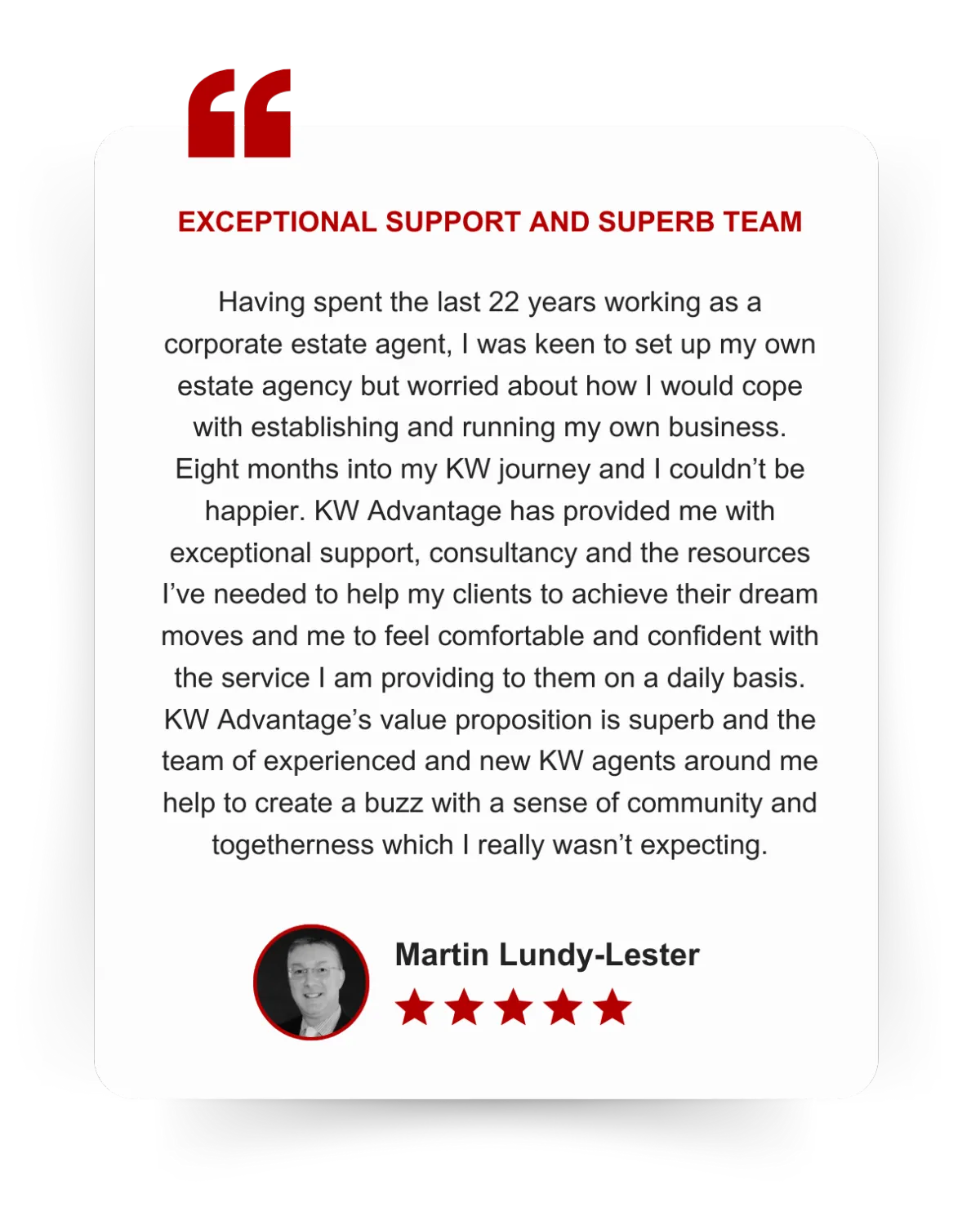 The KW model has been built by modelling successful agents – it is proven. It allows you to have a model to follow, whether you have any previous estate agency experience or not, to successfully grow your business to achieve your goals and dreams.